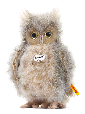 Hoot! Wittie, a wise forest-dweller, is looking for a new home! He stands 6.2 inches tall. Made of gray and brown mohair, airbrushed accents add to Wittie's realistic charm.