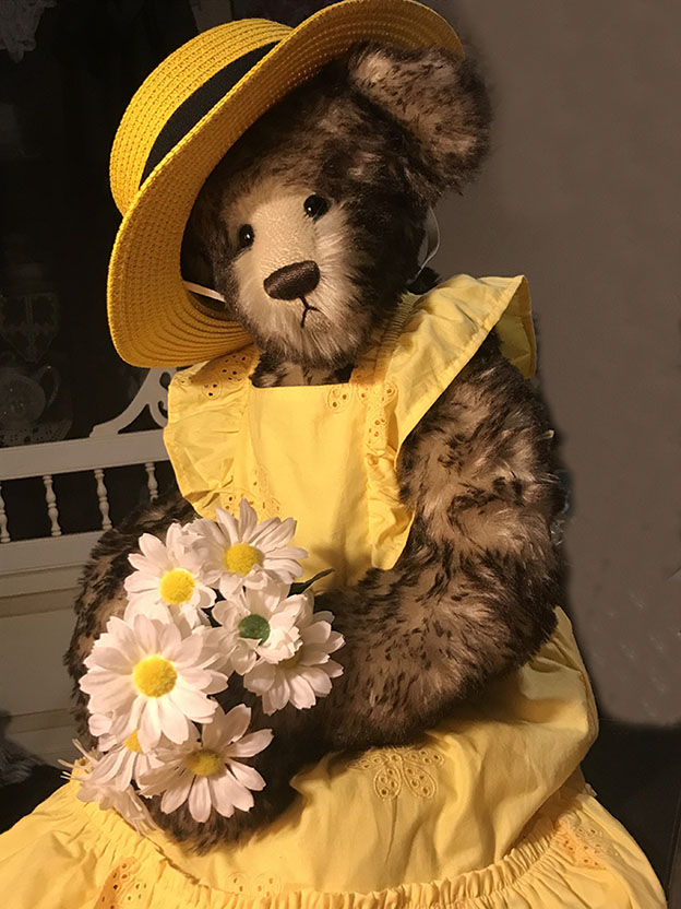 24" Barefoot Teddy Hon-E-Bear is made of wavy mohair with glass eyes. She wears a dress and