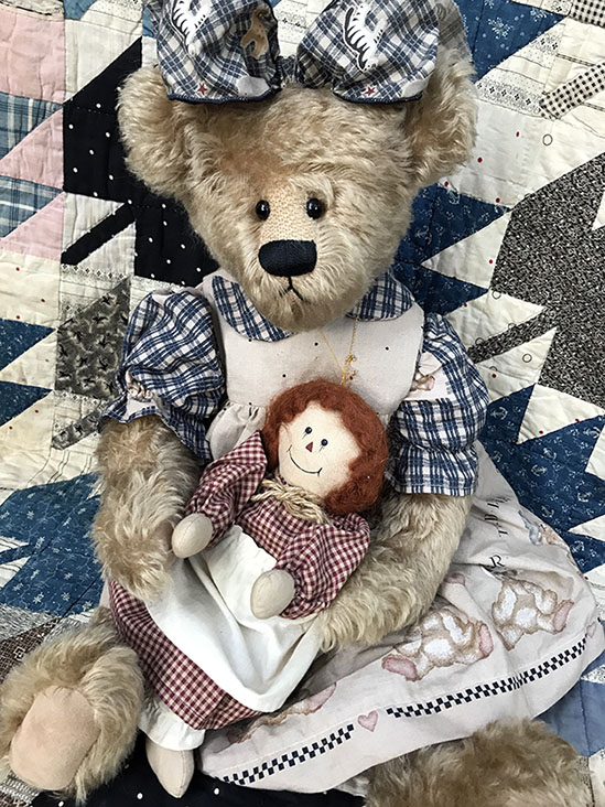 coordinating pinafore handmade by Gloria and holds her handmade dolly, also made by Gloria.