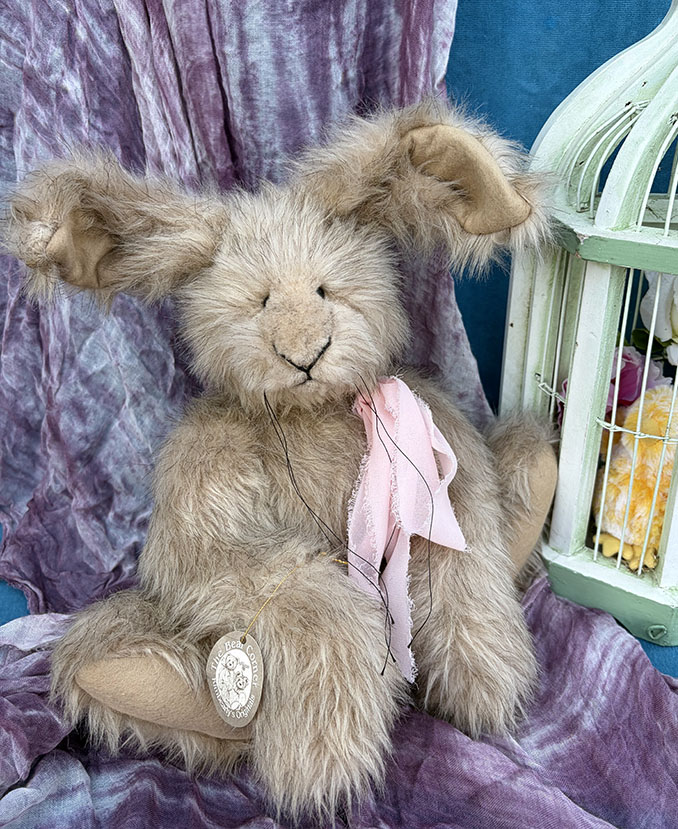 Bunnyby Kimberly HuntMade of thick, shaggy plush, 14" Bunny is fully jointed and softly stuffed with glass eyes,wired ears and flexible armature in her neck so her head can be angled in many positions.Bunny also has some crazy long whiskers!$195.00In Stock!