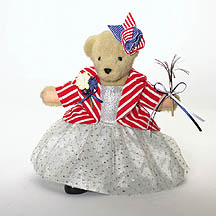 lapel corsage, stars and stripes headbow, and blue high heel pumps complete her