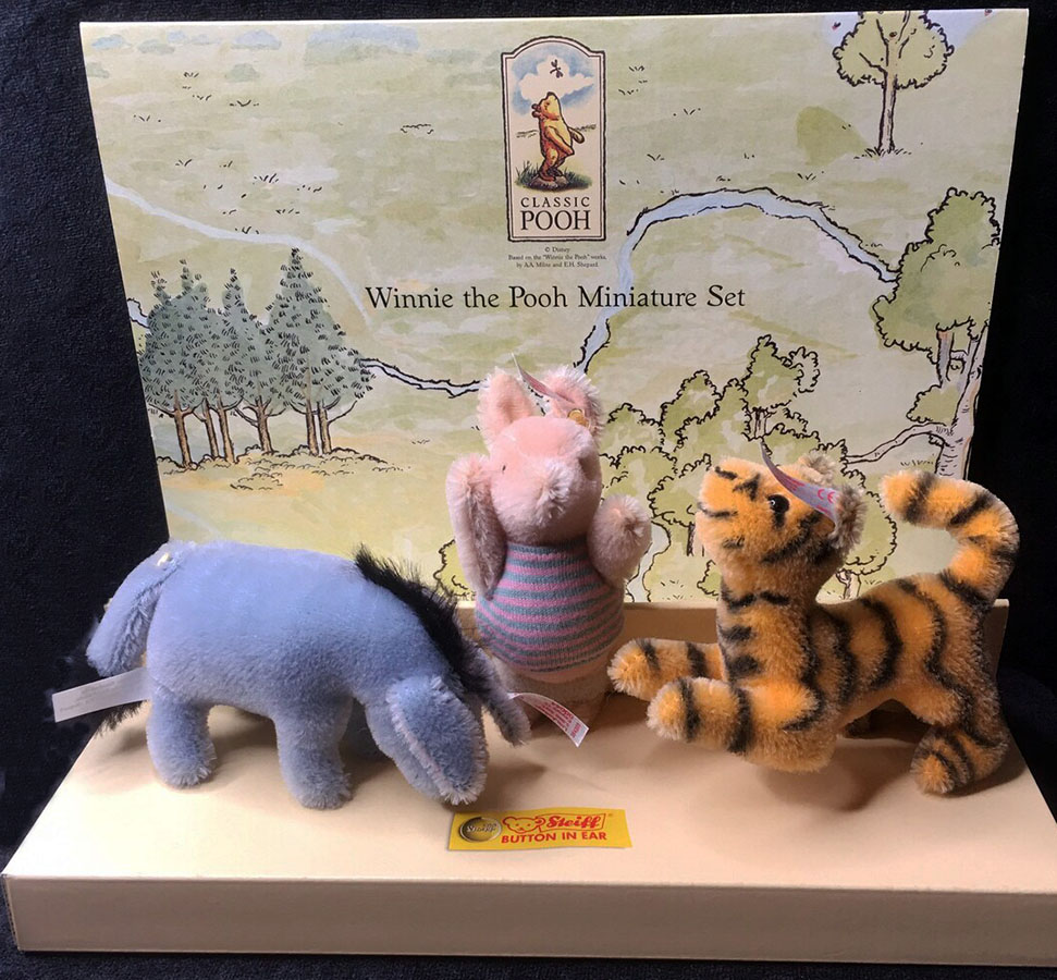 Mini Pooh SetEAN 354205Steiff Winnie the Pooh Miniature set with Eeyore, Piglet and Tigger - 2002 limited edition set of 5000This adorable set has Pooh's 3 best friends Eeyore, Piglet and Tigger.Made of mohair, they 4" in size and each has a white Steiff tag with a button attached to his ear.Eeyore's tail is permanently fixed to his body with a blank Steiff button.