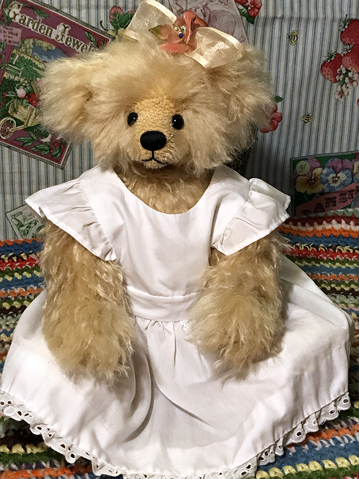 Adorable Lindy is 16" and made of extra long, fluffy silky mohair with a tilt neck and fully jointed. She