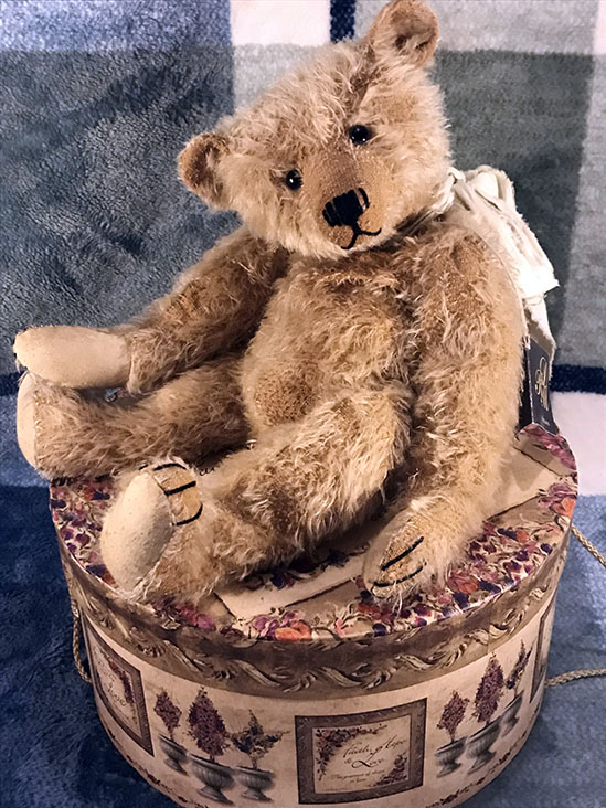16" Dave is sparsely stuffed and heavily distressed giving him the look of a well loved old bear.He's made of tan mohair with felt paw pads and glass eyes and wears a raggedy blue fabric bow.One of a kind
