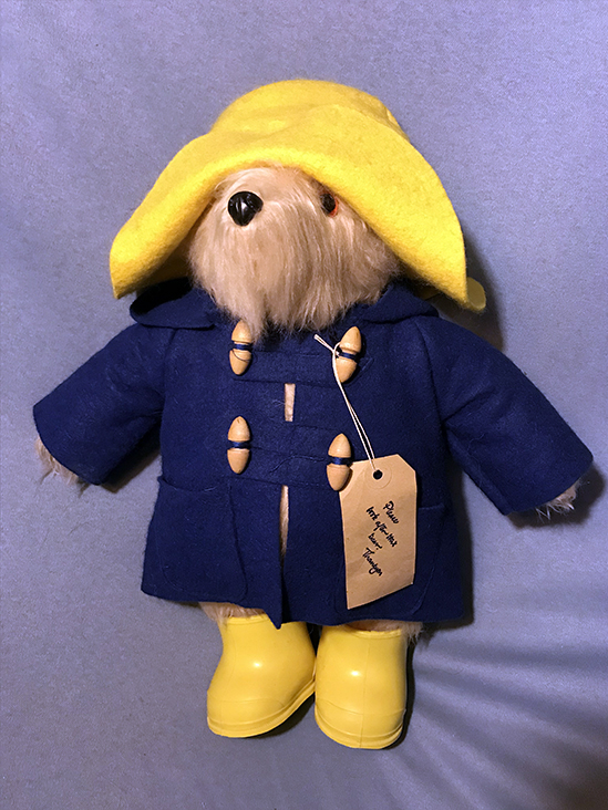 15" Paddington wears a blue felt jacket & yellow felt hat and yellow boots. Original luggage tag.