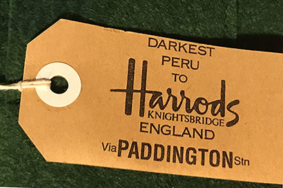 15" Paddington Bear made for Harrods wears a red coat, a green hat with a Harrods emblem * and green boots*. He carries his own Harrods shopping bag and has a special luggage tag that says Harrods. Made of mohair.