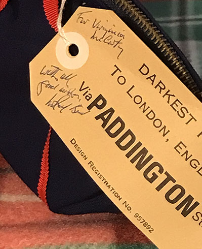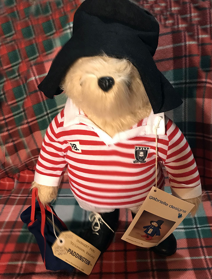 20" Paddington dressed in a red & white rugby shirt, cleated shoes with matching socks and carrying his duffle bag. Peaking under his hat is his sweat band. Excellent condition. Bonus -- on Paddington's luggage tag is a personal note and signature from the late Michael Bond.