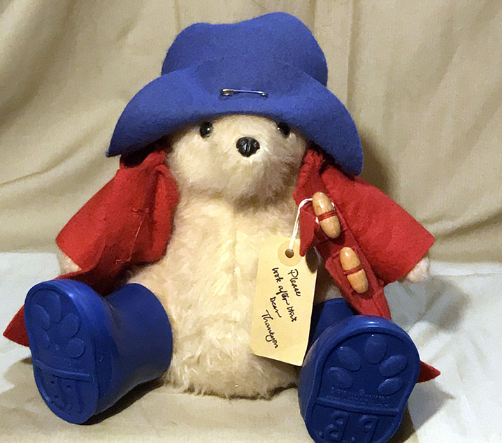9" sitting Paddington wears a red felt jacket, blue felt hat and blue boots.