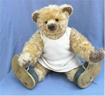 Sneakers It's obvious how 16" Sneakers got his name. His scuffed footwear is a bit oversized, but this bear insists he won't go "bearfoot". Made of wavy blond mohair, Sneakers is fully jointed with distressed felt pawpads. A child's undershirt completes his outfit. Was $260.00 Sold! |