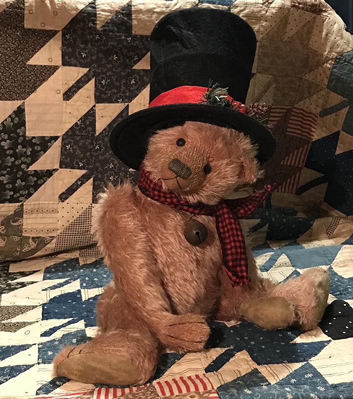 Fitzjames 20" Fitz is made of sparse tan mohair, is loosely jointed and wears a velveteen collar and a large vintage bell around his neck. He's dressed for the holidays in a top hat and red checked ribbon.Shoe-button eyes and stained, distressed felt pawpads gives Fitzjames the appearance of a bear from days gone by. Was $325.00Now $275.00 |