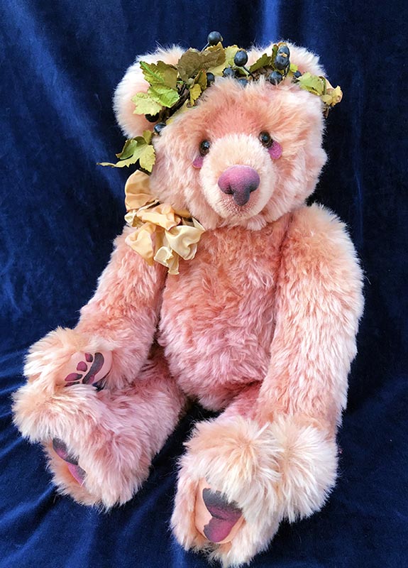 Hand-dyed mohair and incredible sculpted detail makes this one of the most breathtakingbears we've ever seen. Amethyst Glacier's nose and paw pads are made of lovingly moldedand air-brushed ultra suede. She peers through hand-painted glass eyes and her headand neck are adorned with berries and bows. Fully jointed, 24" Amethyst Glacier is solidly stuffedwith pellets and polyfil. She is #5 from a limited edition of 10 and the last one left.