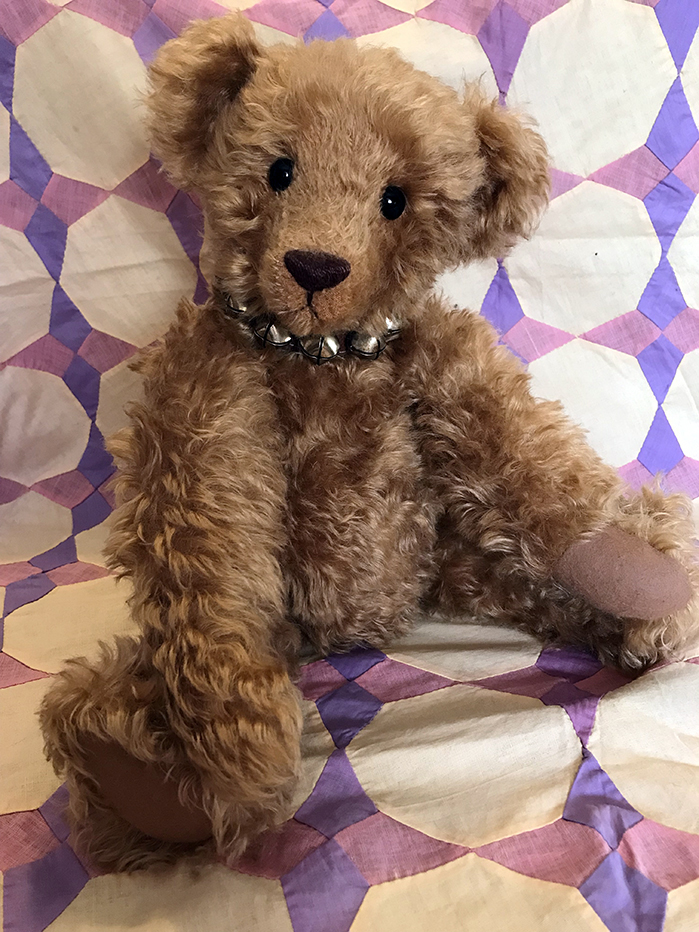 distressed rust-colored mohair, is fully jointed and has glass eyes.