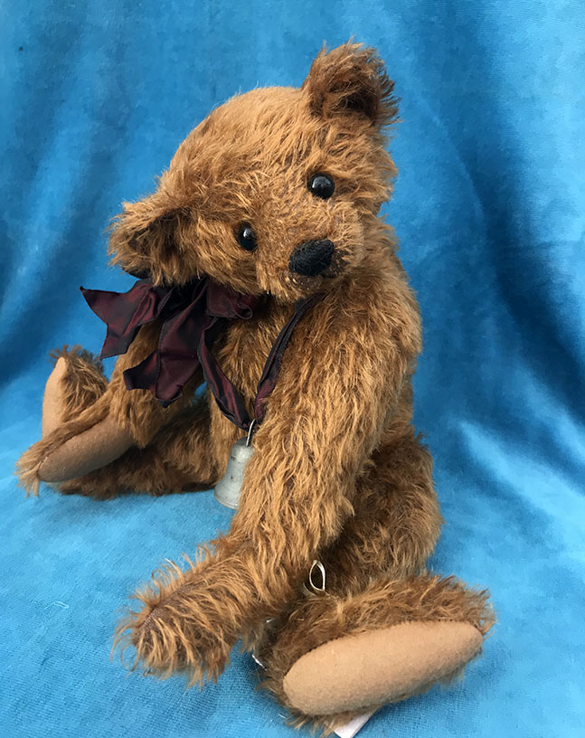Tibbs is 18" tall, fully jointed and made of wavy, caramel colar mohair. He wears a collar of bells.