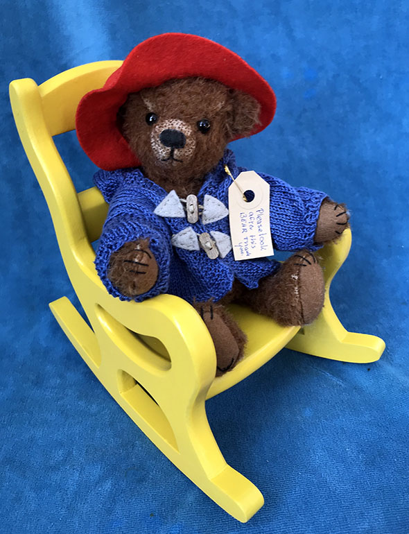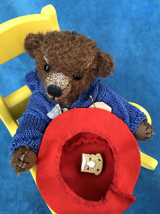 and hand-knit jacket. He comes with his wooden rocking chair and under his hat is PB's favorite snack-a marmalade sandwich.