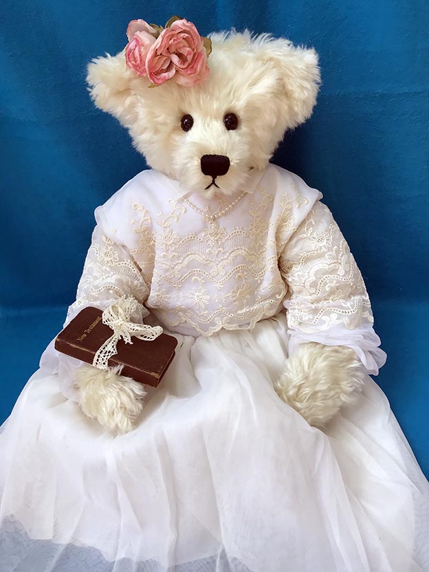 Joli's First Communionby Sandra DicklMade of thick, wavy white mohair, 22" Joli is a big beautiful girldressed in a vintage First Communion dress trimmed in reams of embroidered lace with atiny attached pearl necklace from which hangs an even tinier pearl cross. In her right paw she holds a vintage bible.Joli is fully jointed with large expressive glass eyes and a pearl cotton nose.One of a kind $295.00Sold!